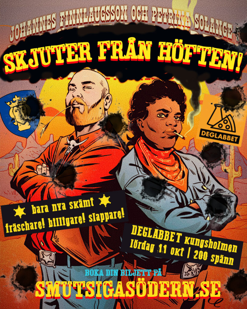 Nu gör vi dock en avstickare för att ladda våra pickadoller med nya skämt! JOFI & PETRINA SKJUTER FRÅN HÖFTEN kommer till Stockholm, närmare bestämt till DEGLABBET på Kungsholmen, lördagen den 11 oktober! Där levererar vi ny, ännu oskriven ståupp på ämnen som du i publiken väljer. Gå på det och se nya roligheter födas!